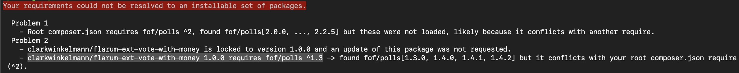 SKevo 14569 all extensions are up to date, as Composer constraints allow: So, you can either have up to date FoF Polls, or remove the Vote With Money extension. I recommend talking to the extension author about updating the FoF Polls dependency.