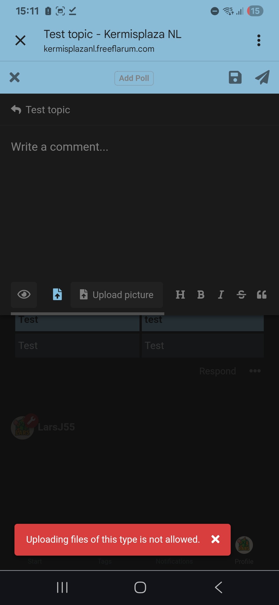 LarsJ55 Forum URL: https://kermisplazanl.freeflarum.com A clear description of the issue: FoF Uploads doesn’t work When I try to upload a photo via FoF Upload, it’s been giving me this message for a while now. Does anyone know what’s going on? I really enjoy using FoF Upload. Thanks in advance.